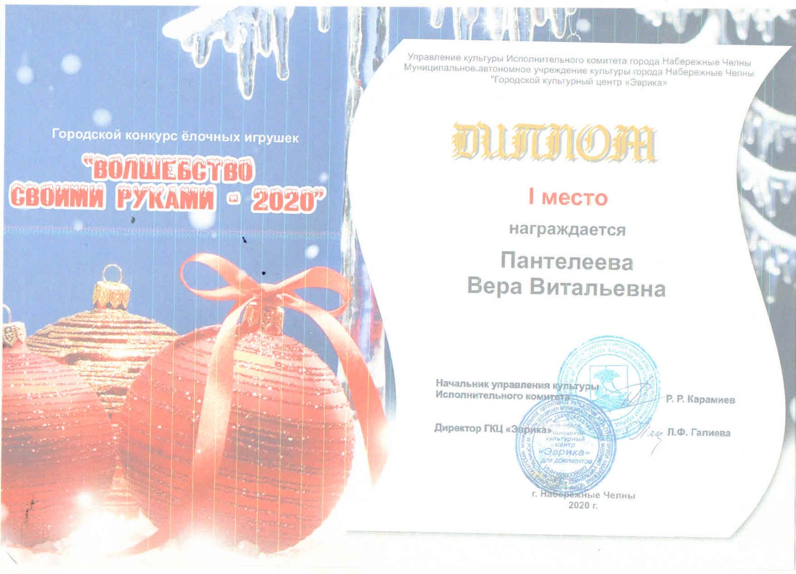 Городской конкурс ёлочных игрушек "Волшебство своими руками-2020" Диплом 1 степени Пантелеева В.В.