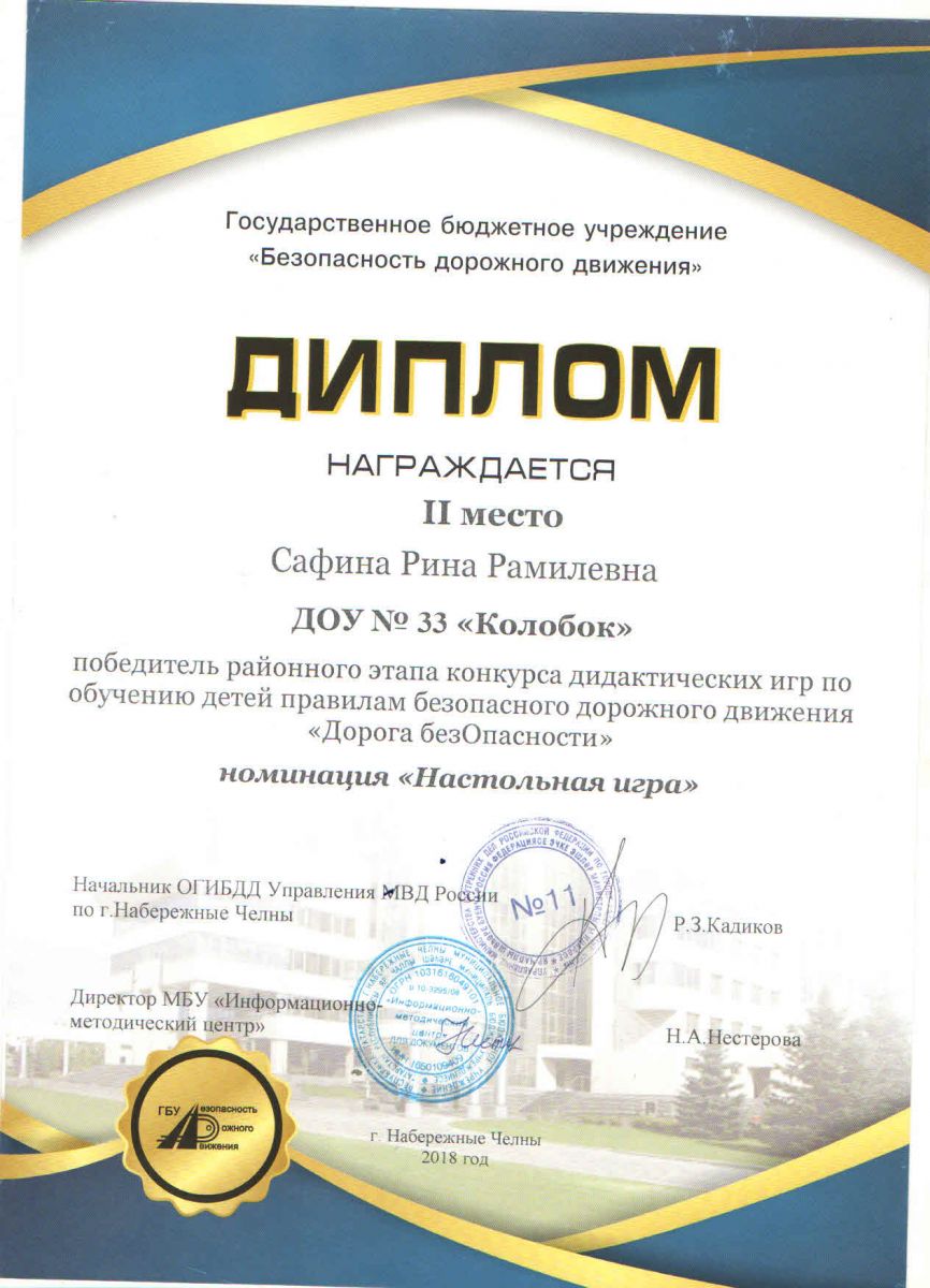Городской конкурс дидактических игр по обучению детей правилам безопасного дорожного движения "Дорога безОпасности" Диплом 2 степени Сафина Р.Р..