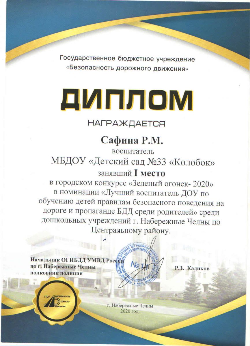 Городской конкурс "Зеленый огонек-2020" в номинации "Лучший воспитатель ДОУ по обучению детей правилам безопасного поведения на дороге и пропаганде БДД среди родителей" среди дошкольных учреждений г. Наб. Челны по Центральному району Диплом 1 степени Сафина Р.Р.