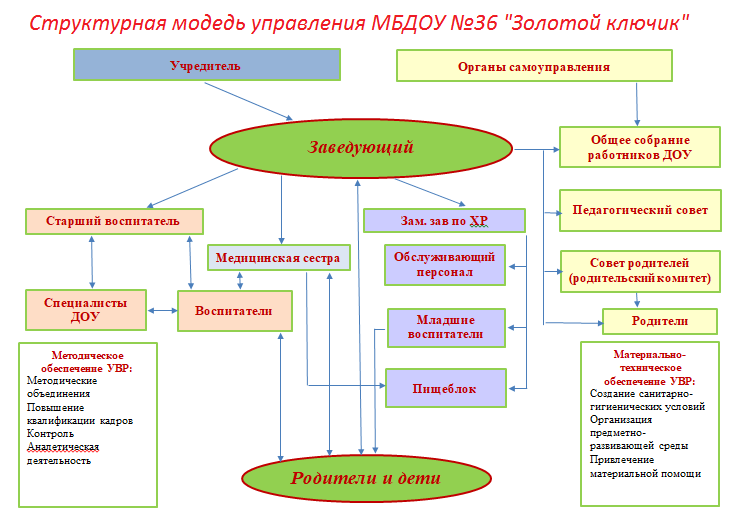 Управление Детским садом строится на принципах единоначалия и коллегиальности. Единоличным исполнительным органом является руководитель – заведующий. Коллегиальными органами управления являются: управляющий совет, педагогический совет, общее собрание работников.