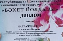 Поздравляем воспитанницу группы №1 Амискину Камилу с Дипломом I степени в номинации "Художественное слово" среди детей 4-5 лет Республиканского фестиваля-коонкурса национального татарского искусства "Бэхет йолдызы". И благодарим педагогов Галиеву Зарю Миргарифановну и Семенову Гульнару Габдрашитовну за слаженную работу при подготовке воспитанницы к конкурсу.
