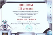 Наконец то мы знаем результаты удивительного робототехнического конкурса "Три "Т": Техника. Талант. Творчество" для наших изобретательных мальчишек. Воспитанник старшей группы № 10 Комарских Тимофей в сложнейшей борьбе одержал заслуженную победу и получил диплом I степени в номинации " Легоград", диплом III степени в номинации "Инженерики". Воспитанник подготовительной группы № 6 Виноградов Владик завоевал диплом I степени в номинации "Легоград". Благодарим родителей и педагогов групп за достойное воспитание и развитие детей.