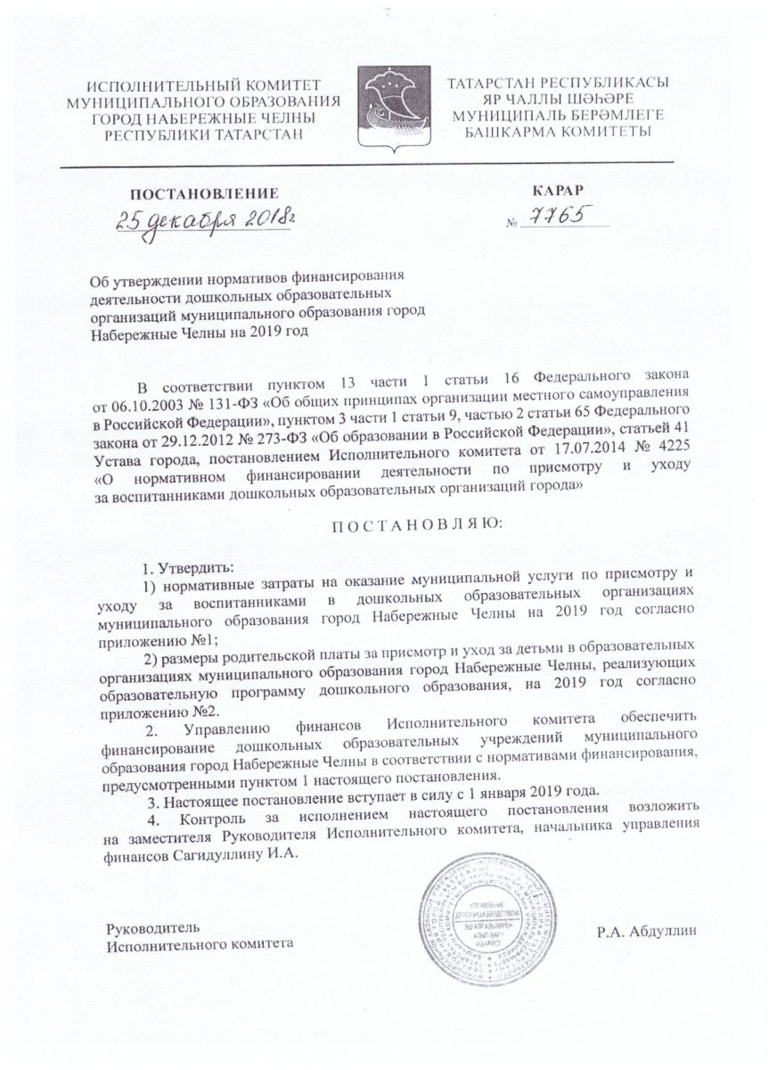 Уведомляем ВАС, что с 1 января 2019 года на основании постановления Исполнительного комитета муниципального образования г.Набережные челны № 7765 от 25.12.2018 года изменяется величина родительской платы за присмотр и уход за детьми в детском саду. Ознакомится с документами вы можете пройдя по ссылкам: