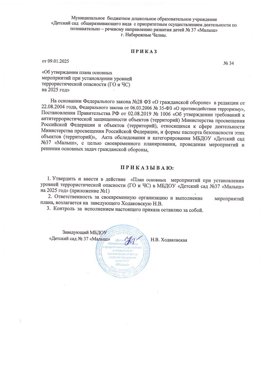 Приказ 34 от 09.01.2025 г Об утверждении плана основных мероприятий при установлении уровней террористической опасности на 2025 год.jpg
