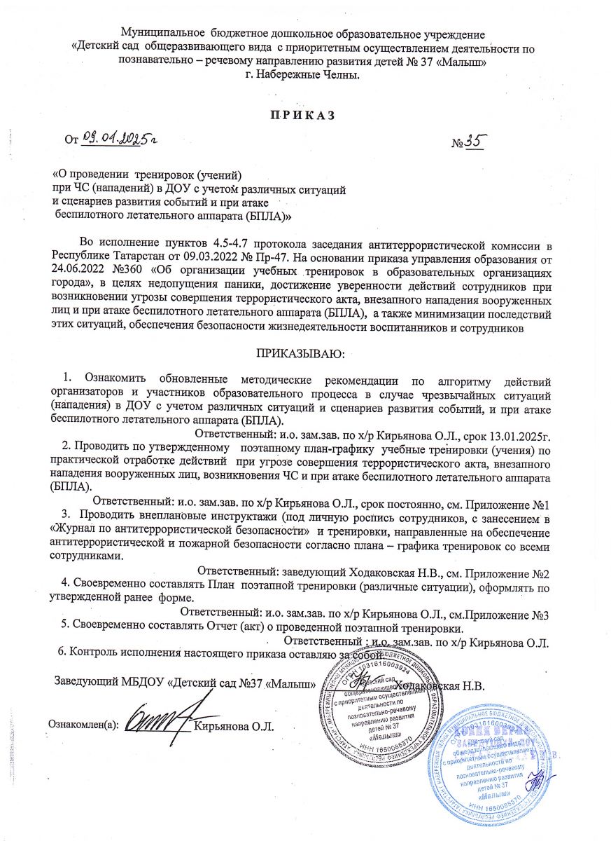 Приказ о проведении тренировок при ЧС (нападений) в ДОУ с учётом различных ситуаций и сценариев развития событий и при атаке беспилотного летательного аппарата (БПЛА) № 35 от 09.01.2025 г..jpg