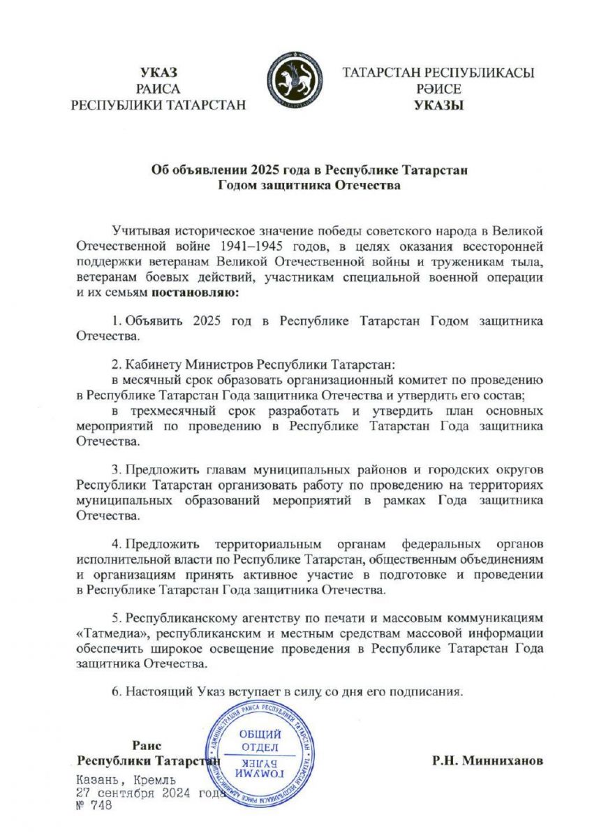 Президент РФ Владимир Путин объявил 2025 год Годом защитника Отечества. Это решение имеет особую значимость в преддверии празднования 80-летия победы в Великой Отечественной войне. Этот год станет данью уважения к ратному подвигу всех, кто сражался за Родину в разные исторические эпохи, а также нынешним героям – участникам специальной военной операции. Тематика года отражает приоритеты современной России, такие как патриотизм, преемственность поколений и уважение к защитникам Родины во все времена.