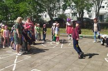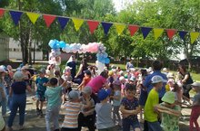В «Аленьком цветочке» сегодня прошёл праздник, посвящённый Дню защиты детей. Праздник прошёл сначала для младших групп, затем для старших. В гости к ребятам приходили Врака-забияка, Веселинка. Они вместе с детьми делали зарядку, танцевали, шутили, проводили эстафеты, игры. В конце праздника ребята рисовали мелками на асфальте яркое лето и пускали мыльные пузыри. -