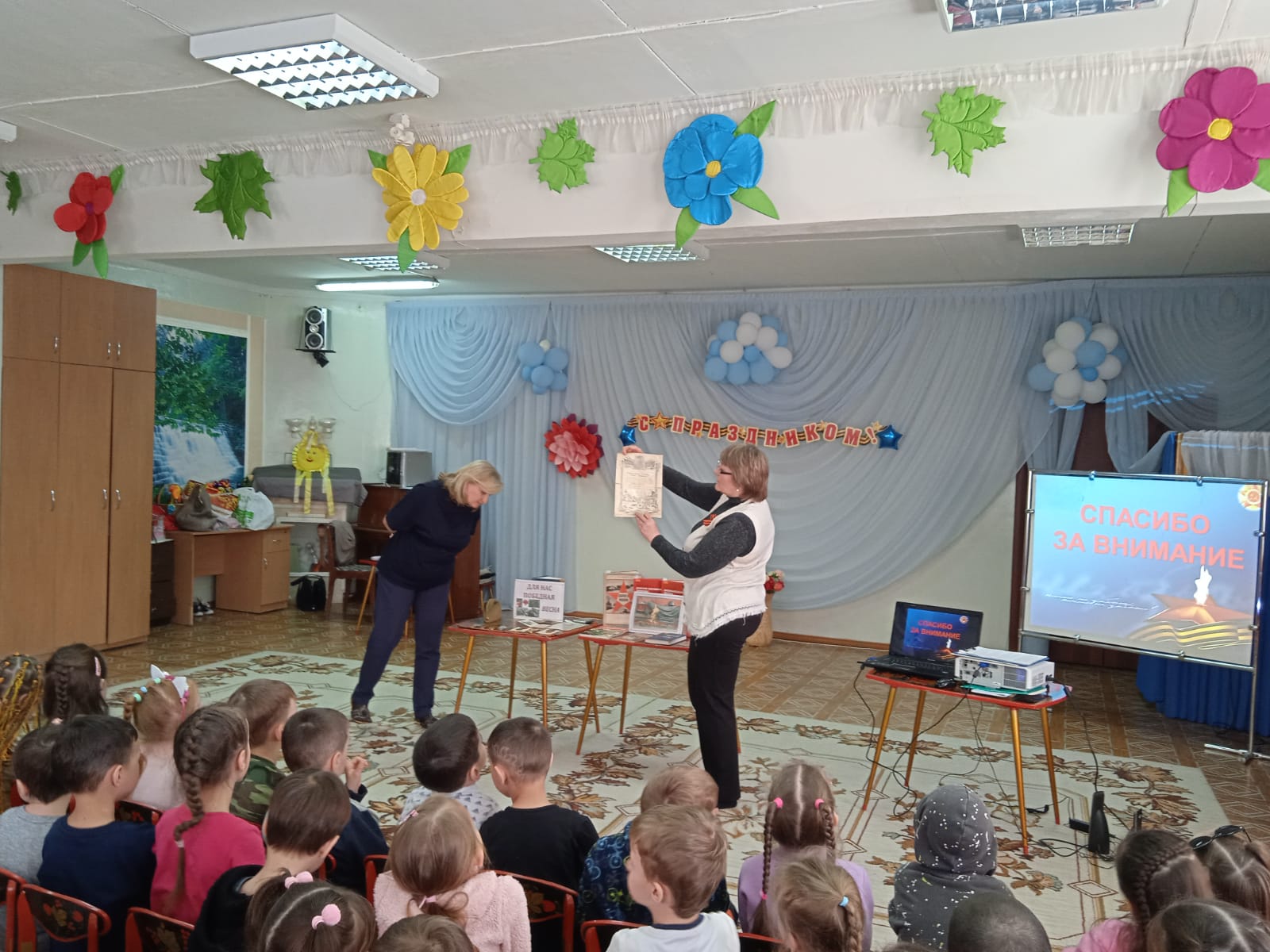 Совместное мероприятие с библиотекой ко Дню Победы. Работники библиотеки подготовили презентацию о войне, о героях, о победе. Дети наяву увидели ордена, медали в мини - музее.