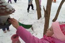 Кормушку папа сделал,Повесил за окном –И вот какой-то смелыйВ ней голубь ест пшено!Весёлые синичкиСлетелись в гости к нам,Я завтра этим птичкамКусочек сала дам.Синички звонко пели,А после, ровно в три,Из леса прилетелиКрасавцы снегири!