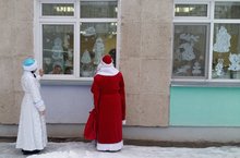 Дети прильнули к окнам и увидели долгожданных гостей. Сколько было радости на лицах у детей, когда Дед Мороз и Снегурочка поприветствовали детей и взрослых помахав всем рукой!