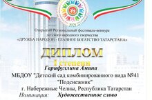 Поздравляем нашу воспитанницу с победой, Диплом I степени в Открытом Региональном фестивале-конкурсе детского народного творчества "Дружба народов - главное богатство Татарстана"
