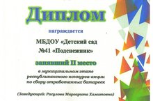 В этом году наш детский сад принял участие в конкурсе по сбору отработанных батареек. Мы заняли II место в муниципальном этапе. Выражаем благодарность всем воспитанникам, родителям и педагогам за активное участие в конкурсе.