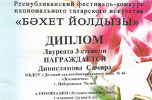 Поздравляем нашу воспитанницу с дипломом Лауреата 3 степени в Республиканском фестиваль-конкурсе национального татарского искусства "Бэхет йолдызы".