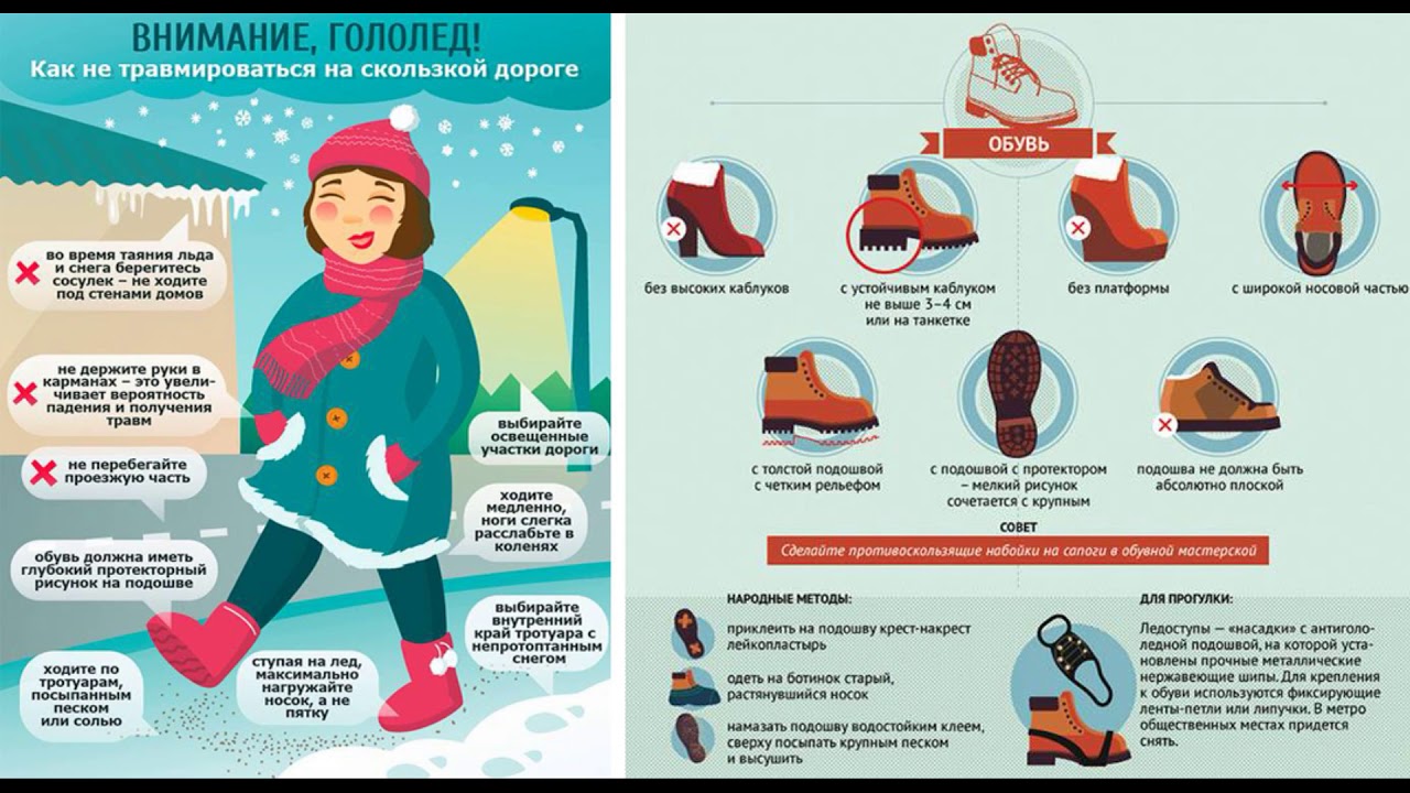С наступлением зимы мы ждем много снега, но, к сожалению, снега совсем мало, зато заморозки чередуются с оттепелью. А это, как известно, наилучшие условия для гололеда. Гололед представляет для нас с вами, уважаемые родители, наибольшую опасность, особенно если мы опаздываем на работу, да еще ребенка нужно успеть отвести в детский сад или школу. Проще простого в гололед получить ушиб, или того хуже перелом. Но травм можно избежать, если знать и соблюдать