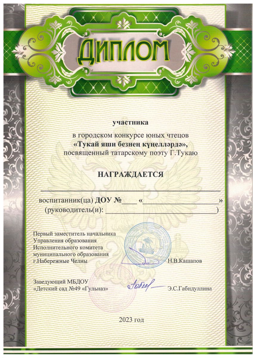 диплом участника конкурса «Тукай яши безнеӊ күӊелләрдә»