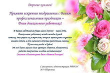 Поздравляем с профессиональным праздником воспитателей и дошкольных работников! У вас не простая, но очень важная работа. Для всех своих воспитанников вы и мама, и подруга, и учитель. За свою карьеру через ваши заботливые руки проходят сотни детей, и ко всем вы находите нужный подход. Желаем вам никогда не терять терпения, сохранить душевное и физическое здоровье и получать настоящую радость от своей работы.