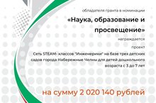 Конец учебного года радует нас новыми победами: детские сады «Калейдоскоп», «Крепыш», «Теремок» стали обладателями гранта в номинации "Наука, образование и просвещение" с социальным проектом сети STEAM – классов «Инженерики»!