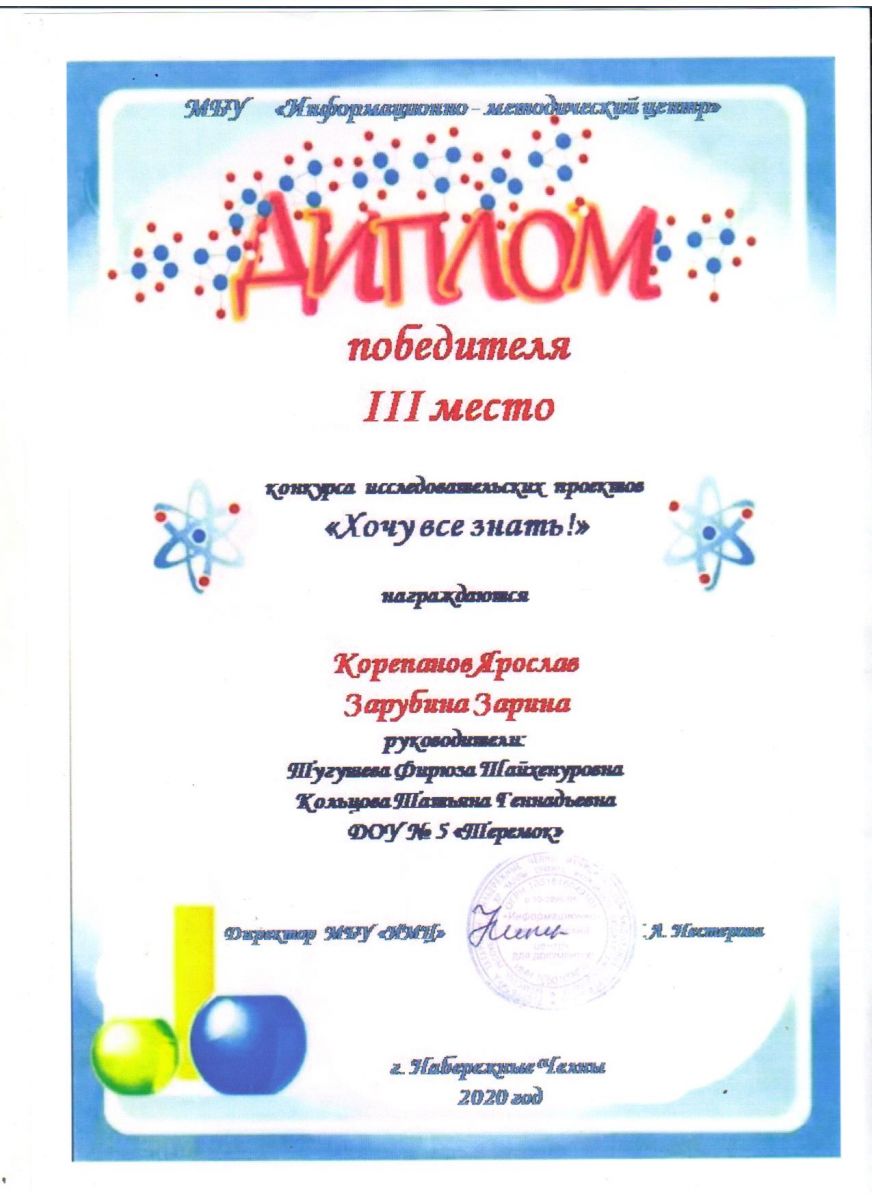 Также с этим проектом дети заняли 3 место в конкурсе исследовательских проектов «Хочу все знать»