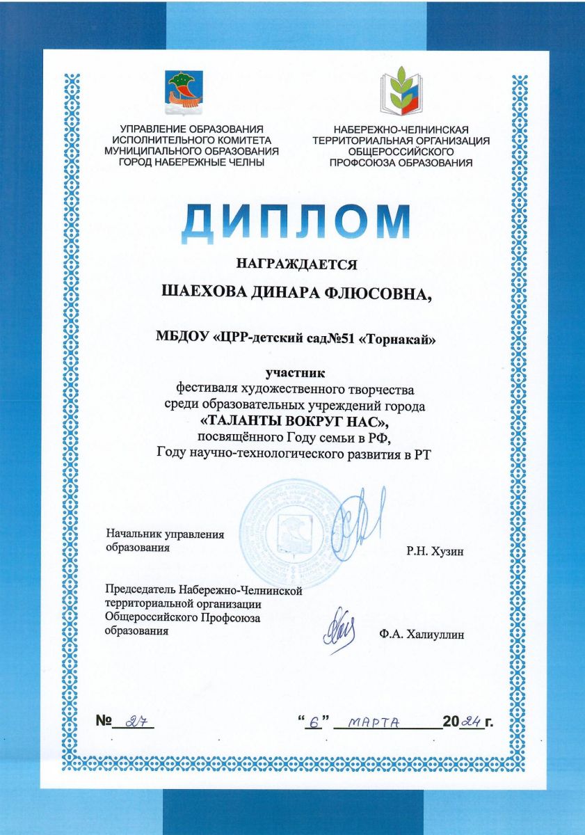 Шаехова Динара Флюсовна младший воспитатель ДОУ №51 "Торнакай" стала участником фестиваля художественного творчества среди образовательных учреждений города "Таланты вокруг нас", посвященного Году семьи в Российской Федерации, Году научно-технологического развития в республике Татарстан.