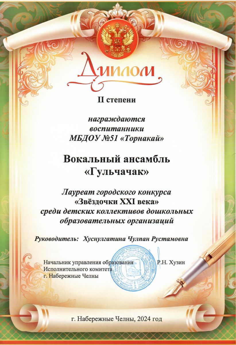 Поздравляем вокальный ансамбль "Гульчачак" и музыкального руководителя Хуснулгатину Чулпан Рустамовну с победой с 2 местом в городском творческом конкурсе талантов "Звездочки XXI века"!