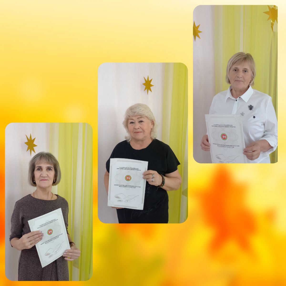 Почетной грамотой Министерства образования и науки Республики Татарстан: Файрушина А.Г. - инструктор по физической культуре; Давлиева Н.А. - заместитель заведующего по ХР; Хафизова Н.Г. - делопроизводитель;