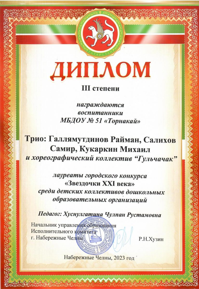 Трио мальчиков и хореографический ансамбль "Гульчачак" под руководством музыкального руководителя Хуснулгатиной Чулпан Рустамовны завоевали победное третье место в городском конкурсе "Звездочки XXI века".