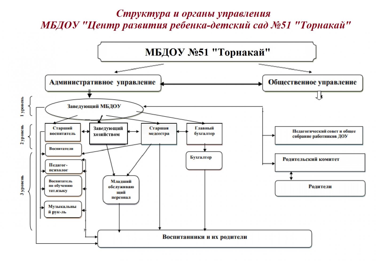 Управление МБДОУ «Центр развития ребенка-детский сад №51 «Торнакай» осуществляется на основе сочетания принципов единоначалия и коллегиальности.