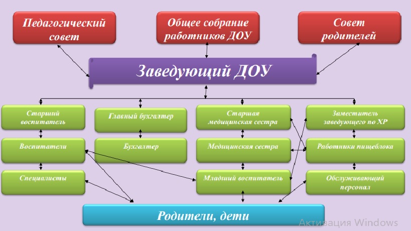 старший воспитатель, заместитель заведующего по административно-хозяйственной части, главный бухгалтер, которые взаимодействуют с соответствующими объектами управления.