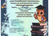 Поздравляем нашу воспитанницу Амалию с победой в Республиканском конкурсе "Юный декламатор" в номинации "Составление описательного рассказа по игрушке (предметной картинке)
