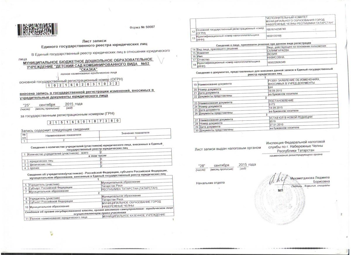 Короткое название: МБДОУ «Детский сад комбинированного вида №52 «Сказка»