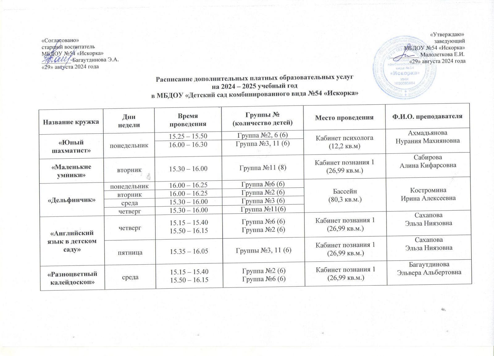 Расписание платных образовательных услуг на 2024 - 2025 учебный год