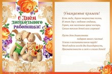 Дорогие наши коллеги! Пускай под крышей нашего любимого детского сада всегда царит добрая, светлая и хорошая атмосфера. Пускай в стенах этого дома каждому будет уютно, тепло и спокойно. Спасибо вам за то, что благодаря; вашей слаженной и четкой работе, вашим огромным, добрым сердцам, теплым и нежным рукам, мы все, вместе с нашими воспитанниками, чувствуем себя одной большой семьей. Желаю каждому из вас, всегда чувствовать себя счастливым и всегда находить повод для улыбки. С праздником!