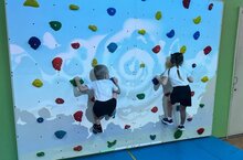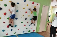 Ребята подготовительной к школе группы № 6 на физкультурном занятии отрабатывали навык правильной постановки рук и захватов руками на скалодроме, приобретенном при поддержке БФ "Татнефть".