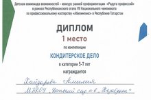 Поздравляем воспитанницу 3 группы Хайдарову Амилию с успешным выступлением в конкурсе ранней профориентации "Радуга профессий", который прошел в рамках Республиканского этапа VII Национального чемпионата по профессиональному мастерству в Республике Татарстан. Амилия награждена Дипломом 1 степени, в номинации "Кондитерское дело".
