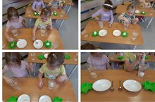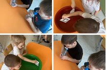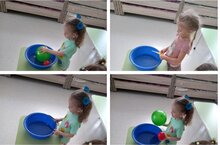 Дошколятам дали понятие о том, что легкие предметы не только плавают, но и могут «выпрыгивать» из воды. Поиграли с мячом, опустили в воду, чтобы выяснить: утонет ли мяч в воде? Зависит ли величины мяча?