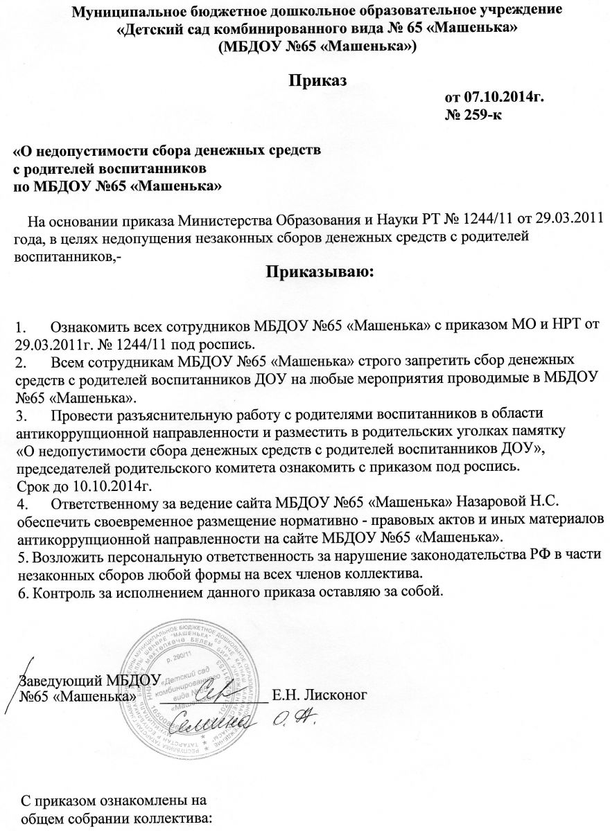 Приказ МБДОУ О недопущении незаконных сборов денежных средств с родителей