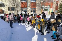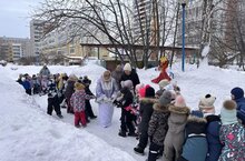 В день праздника двор детского сада был украшен яркими ленточками. Дети с удовольствием участвовали в различных конкурсах и играх: катались на санках, соревновались в метании снежков, а также водили хороводы вокруг "Масленицы".