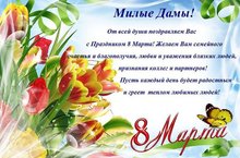 Милые, нежные, прекрасные женщины! Пусть этот день, подарит вам прекрасное настроение, исполнение желаний! Искренних вам комплиментов и добрых слов всегда! С весенним праздником!