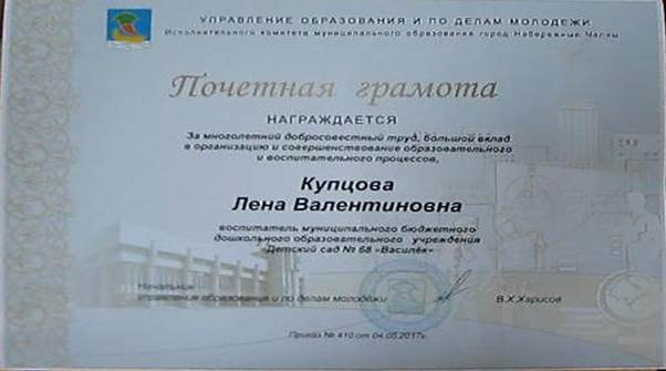 Опубликовано: 30.05.2017Почетной грамотой Управления образования и по делам молодежи Исполнительного комитета муниципального образования г. Набережные Челны за многолетний добросовестный труд, большой вклад в организацию и совершенствование образовательного и воспитательного процессов НАГРАЖДЕНА Купцова Лена Валентиновна - воспитатель 4 группы.