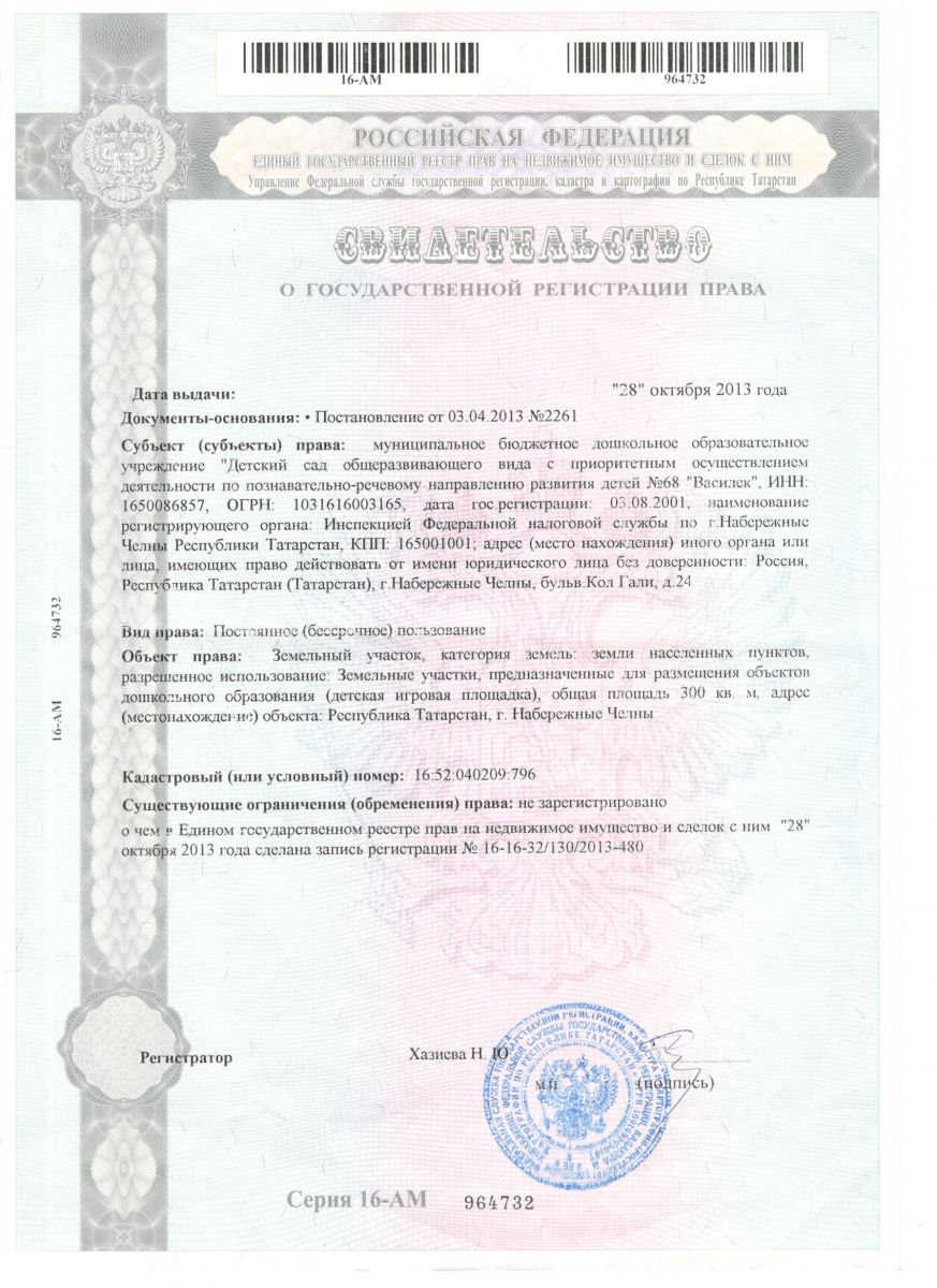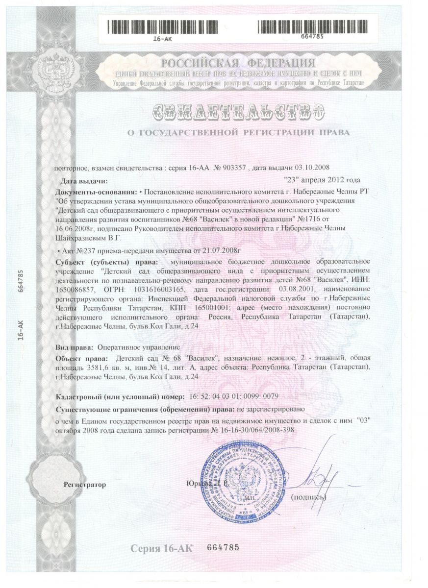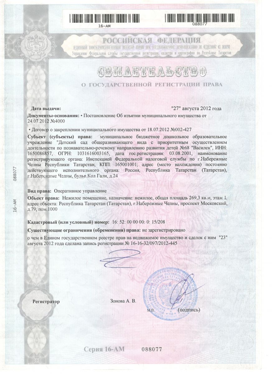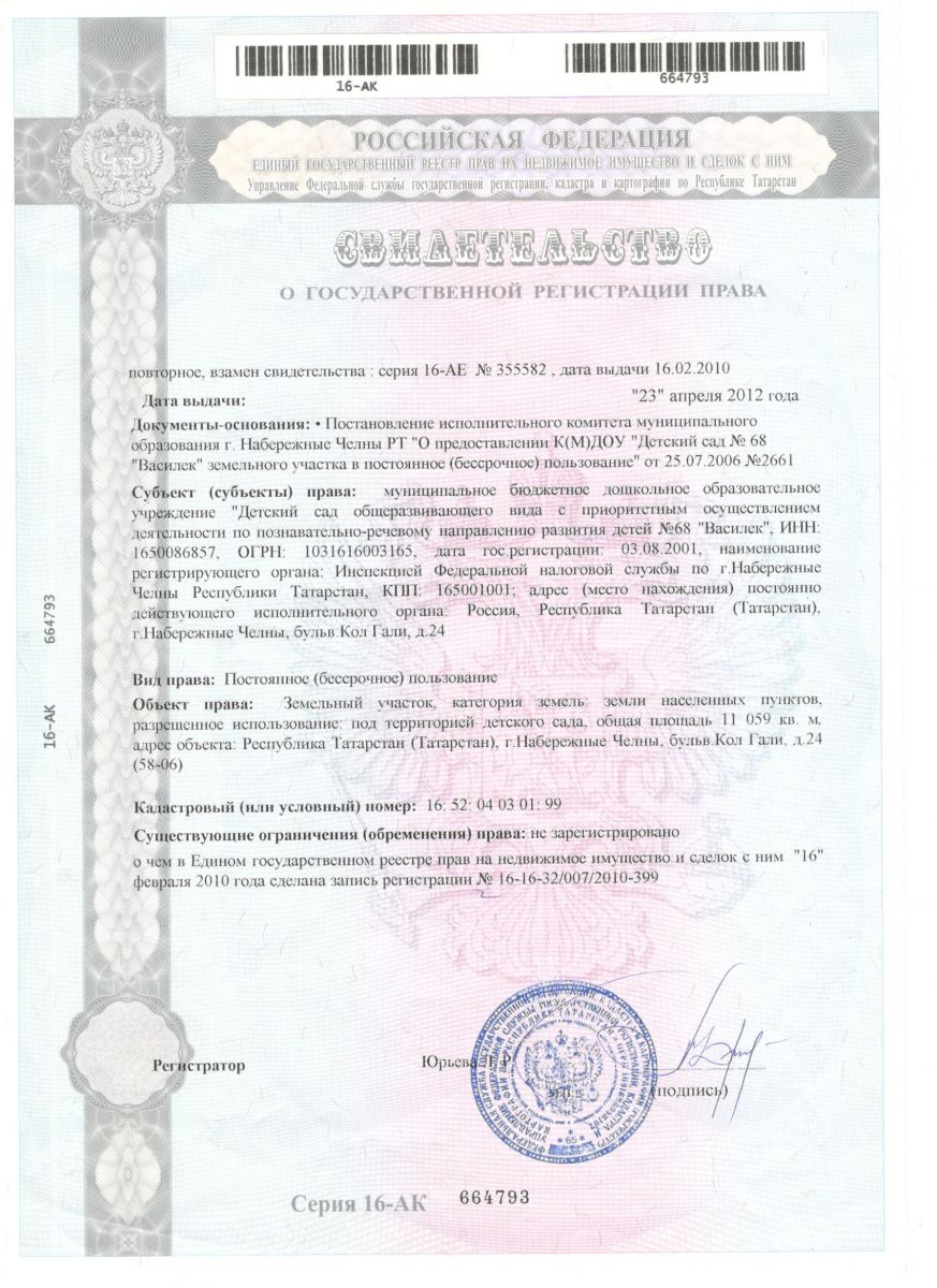 Свидетельство о государственной регистрации права (детсад, земельный участок, нежилое помещение)