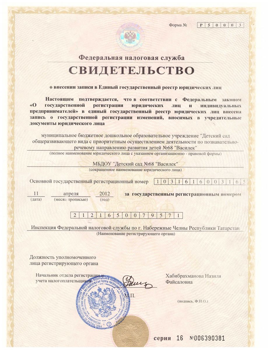 Свидетельство о внесении записи в ЕГРЮЛ