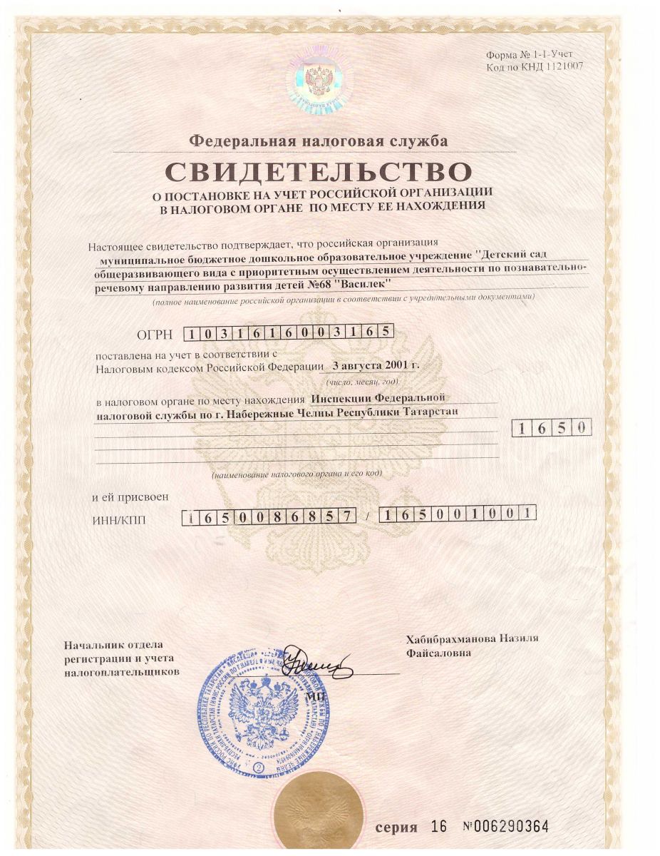 Свидетельство о постановке на учет в налоговый орган