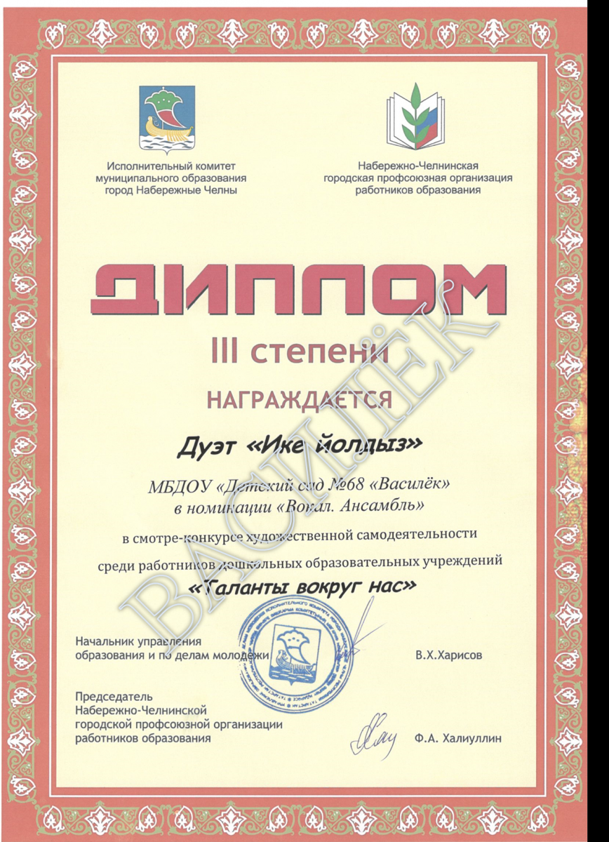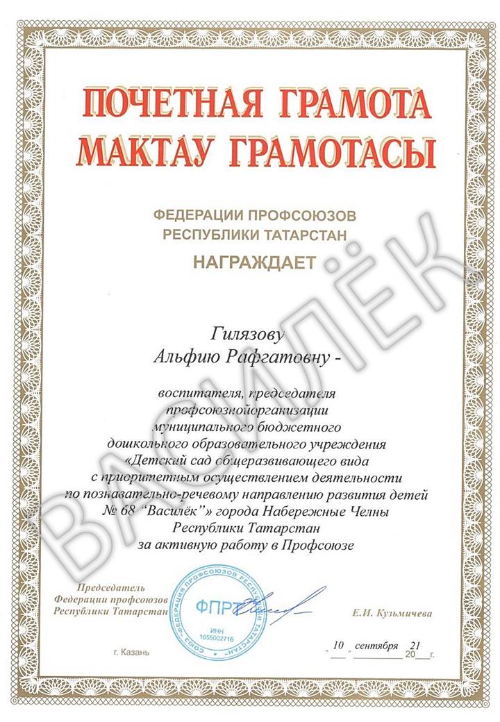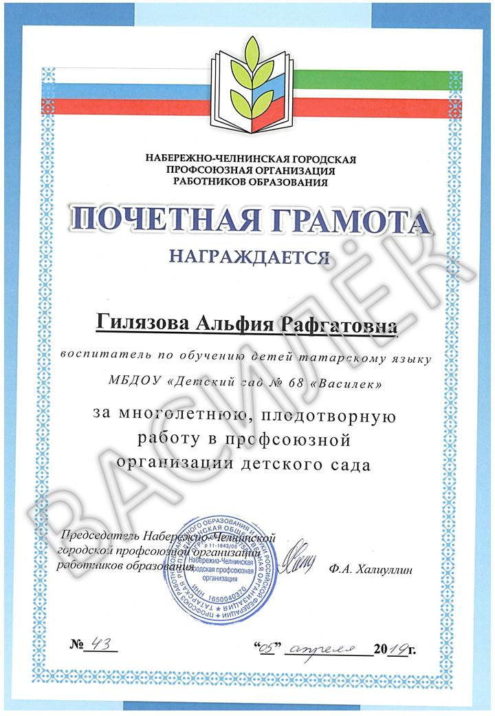 с 2008 г. и по сей день - Гилязова Альфия Рафгатовна, воспитатель по обучению детей татарскому языку. Педагогический стаж 33 года, стаж работы в профкоме 12 лет. Награждена почетной грамотой Управления Образования, лауреат премии мэра города Набережные Челны. В октябре 2012 г. награждена почетной грамотой Набережно-Челнинской городской профсоюзной организации работников образования за многолетний плодотворный труд и активное участие в профсоюзной жизни города. В 2014, 2019 - почетная грамота Набережночелнинской городской профсоюзной организации работников образования, 2021 - почетная грамота Федерации профсоюзов республики Татарстан, за активную работу в Профсоюзе; Благодарность от Исполнительного комитета г. Набережные Челны Республики Татарстан «За заслуги в обучении и воспитании подрастающего поколения и добросовестный труд»Награждена нагрудным знаком Министерства Образования и Науки Республики Татарстан «За заслуги в образовании», 2022 г.