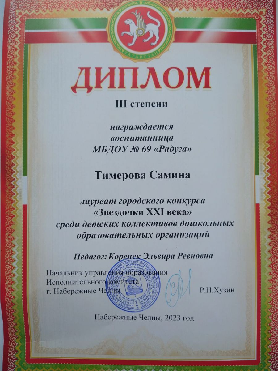 Талантливая и целеустремленная воспитанница детского сада - Тимерова Самина достойно вышла в финал муниципального конкурса "Звездочки 21 века" и стала Лауреатом 3 степени в номинации "Вокальное исполнение"!