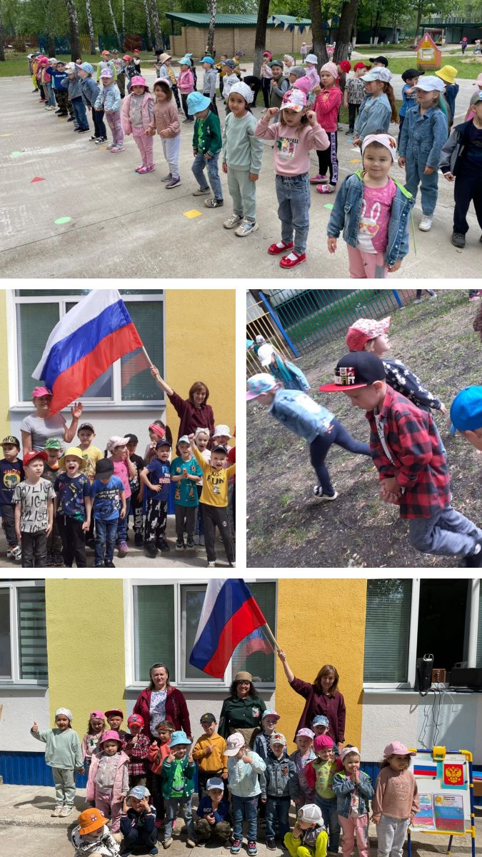 В этот день в начале лета – именинница она!День рождения России отметила детсадовская детвора. Ребята на праздники вспомнили о главных символах страны, отвечали на вопросы викторины, показывая свои знания торжественно слушали Гимн - главную песню нашей страны. Не обошлось на празднике без приключений: выяснилось, что исчез самый главный символ страны - флаг! А спрятала его сказочная жительница дремучего леса - Баба яга. Ребята прошли все испытания, и Баба яга вручила дошколятам Российский флаг. Завершился праздник танцевальным флешмобом!