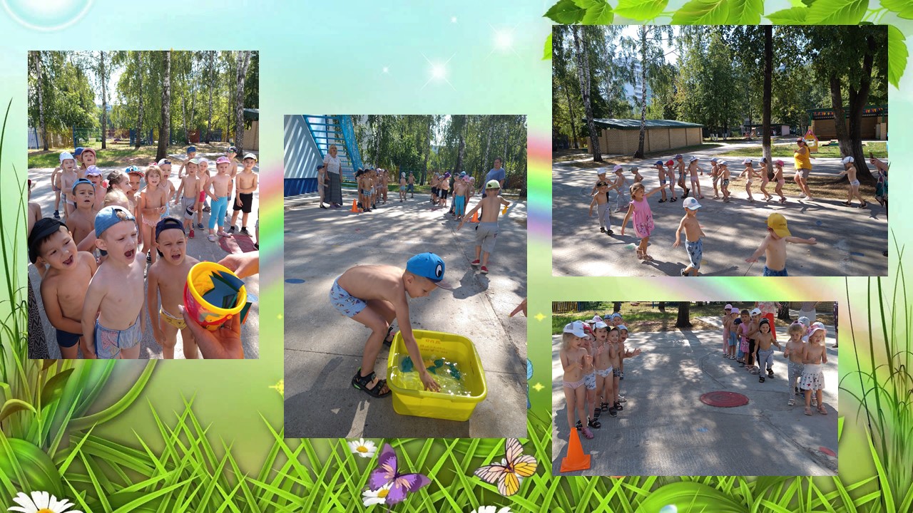 Чтоб здоровыми нам быть.Солнечная, жаркая погода в августе - это радость для ребят! Можно загорать, принимать воздушные ванны, плескаться прохладной водичкой. В нашем детском саду объявлена Неделя Здоровья, где ребята укрепляют свое здоровье. На Неделе здоровья проводятся игровые и познавательные занятия, сочетаются различные виды детской деятельности — всё, что нравится детям. Музыкальные развивающие игры на свежем воздухе под руководством музыкального руководителя Коренек Э.Р. вызывают у детей радость и восторг. Важно слышать музыку, иначе можно попасть под самый настоящий дождик. Еще музыка приглашает путешествовать по летним дорожкам, где нужно проскакать как лошадка, полететь на самолете, пройтись как медведь в лесу. Подготовленная инструктором по физической культуре Шевыревой О.Ф. "Тропа здоровья", способствует профилактике плоскостопия, укрепляет мышцы ребят. Ребята босиком идут по песочку, камешкам, различным приспособлениям, собирают пальчиками ног предметы.