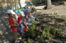 лето в детском саду 13.07.2016 труд - рыхление и поливка клумбы - дети 7 группы