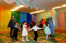 В подготовительной группе № 2 ребята поводили хоровод с осенними персонажами с Ветром и Слякотью.