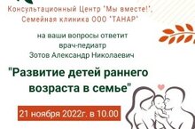 21 ноября в 10.00 Консультационный Центр "Мы вместе" приглашает Вас на встречу "Развитие детей раннего возраста в семье", где на ваши вопросы ответит заслуженный врач-педиатр Семейной клиники "Танар" Александр Николаевич Зотов. Добро пожаловать!