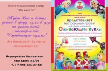 "Набережночелнинский государственный театр кукол представляет театральный проект для самых маленьких "Оживающие куклы": театрализованная развлекательная программа, увлекательный мастер-класс по кукловождению, игры и забавы, театр в лицах, улыбки и смех.